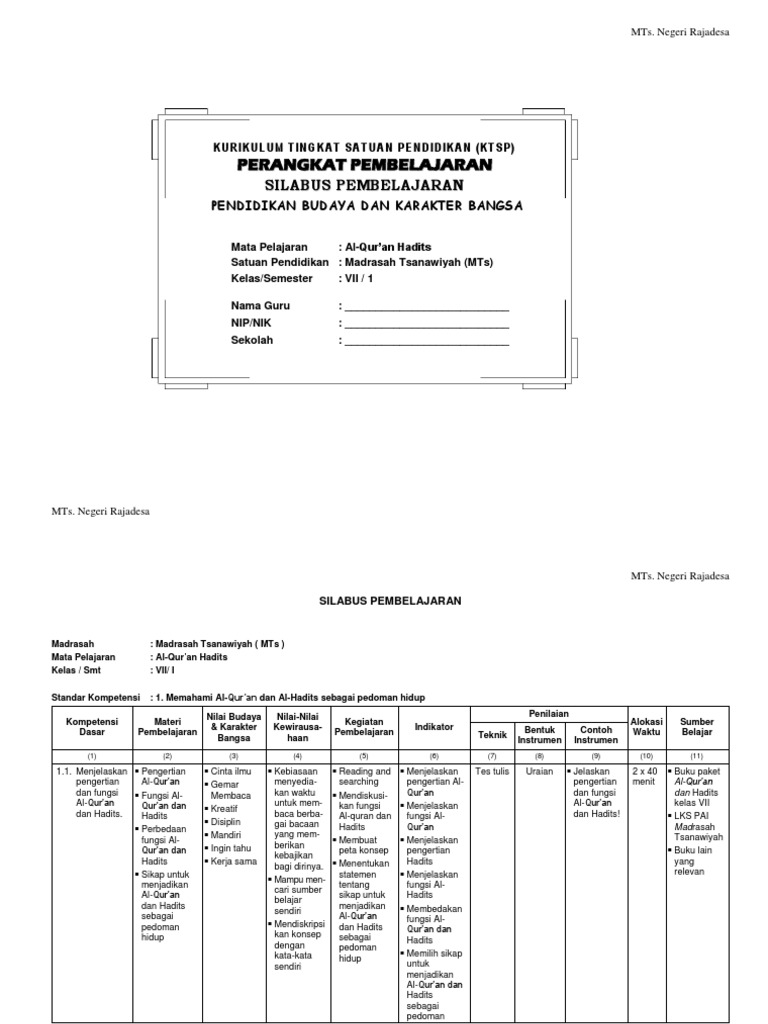 Lebih jelasnya bapak ibu dewan guru bisa melihat penampakan gambar silabus sejarah indonesia kelas 7/ vii k13 revisi 2018 di. Silabus merupakan dasar bagi seorang guru dalam membuat perangkat pembelajaran rpp. Skl sk kd al quran hadits kelas vii sem 1 & 2. Silabus al quran hadits mts kelas vii dan viii kurikulum 2013. Selain rpp qur'an hadits mts kurikulum 2013, masih banyak perangkat lainnya yang harus dibuat seperti silabus, program tahunan, program semester, kkm, dan perangkat pembelajaran qur'an hadits pelengkap yang semuanya bisa anda dapatkan dalam blog.